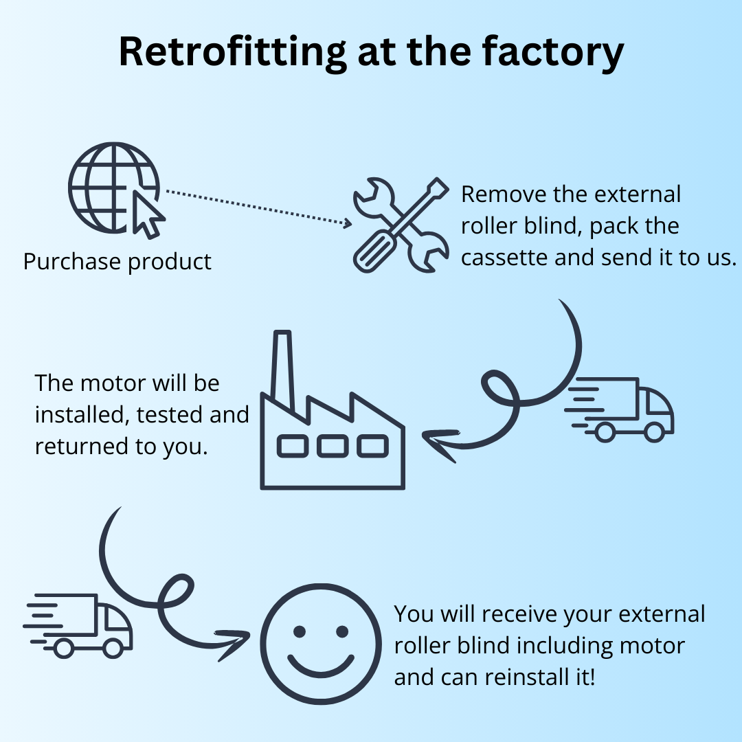 This product is only for when you want to send in your existing external roller blind against heat and we retrofit the motor in our factory. Incl. shipping costs to the factory and return shipping to you!